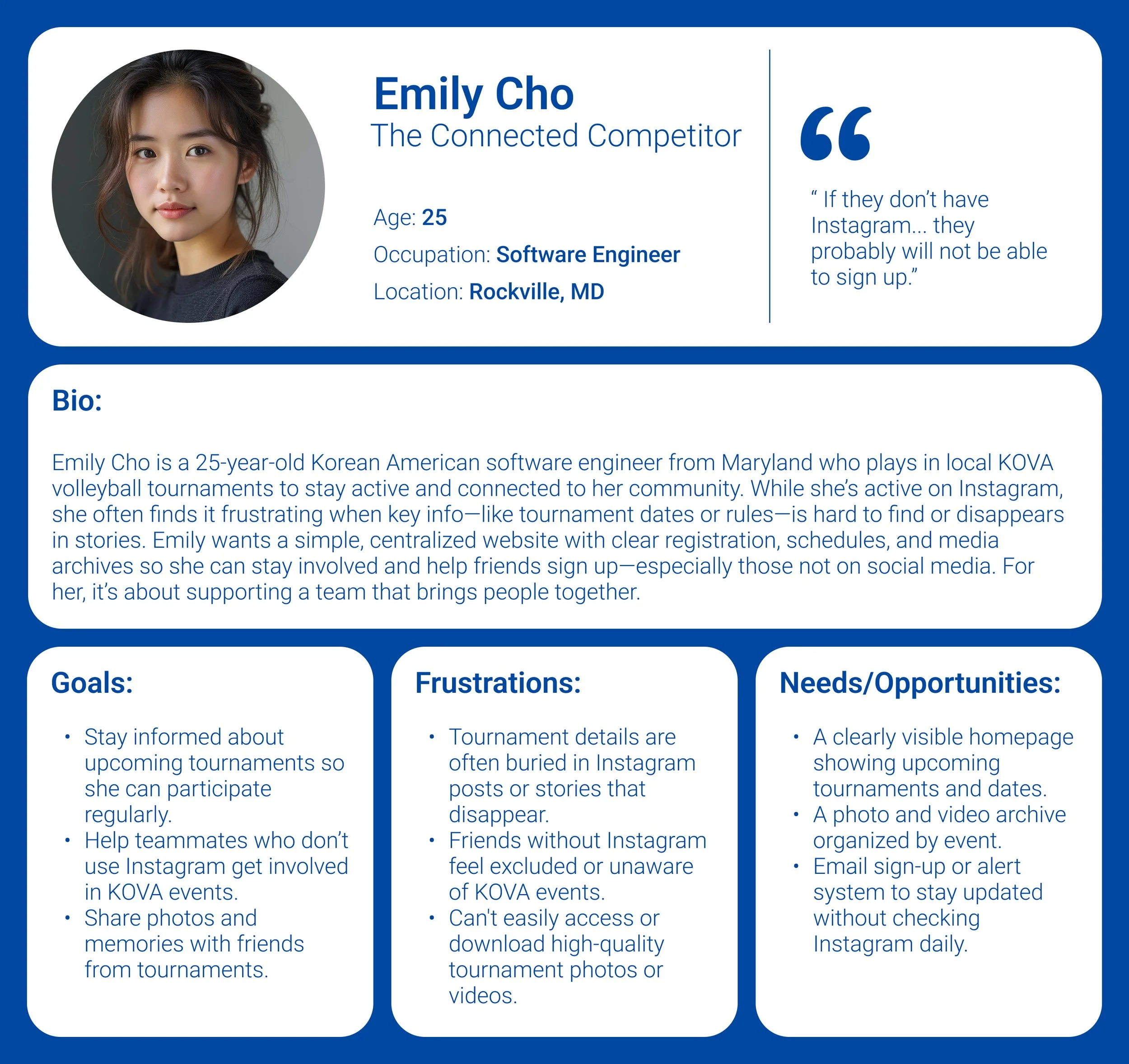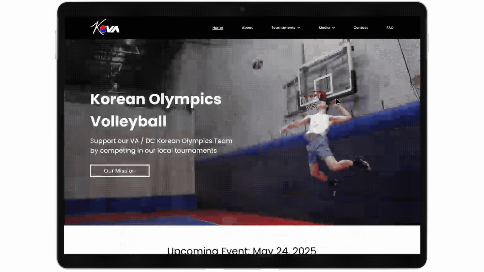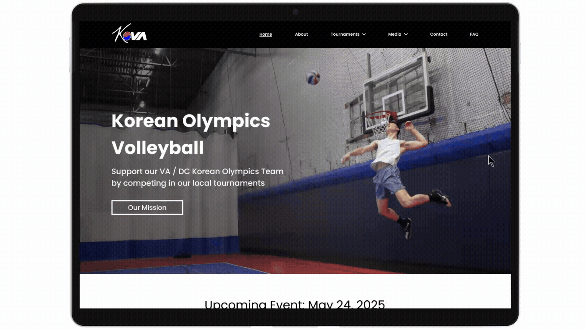 KOVA is a DC/VA volleyball team that hosts tournaments throughout the year. It was started in efforts to raise money for players on the team to attend the official Korean Olympics tournament that takes place in a different location every two years. Currently, this team has an instagram account that features a link to sign up for tournaments in the bio. Pictures are posted when tournament sign ups are open and sometimes show winners of the tournaments. They do not, however, have an official website, so it is difficult to access their information if someone does not use Instagram. The founders have expressed interest in creating a website to give more information and make it more accessible.