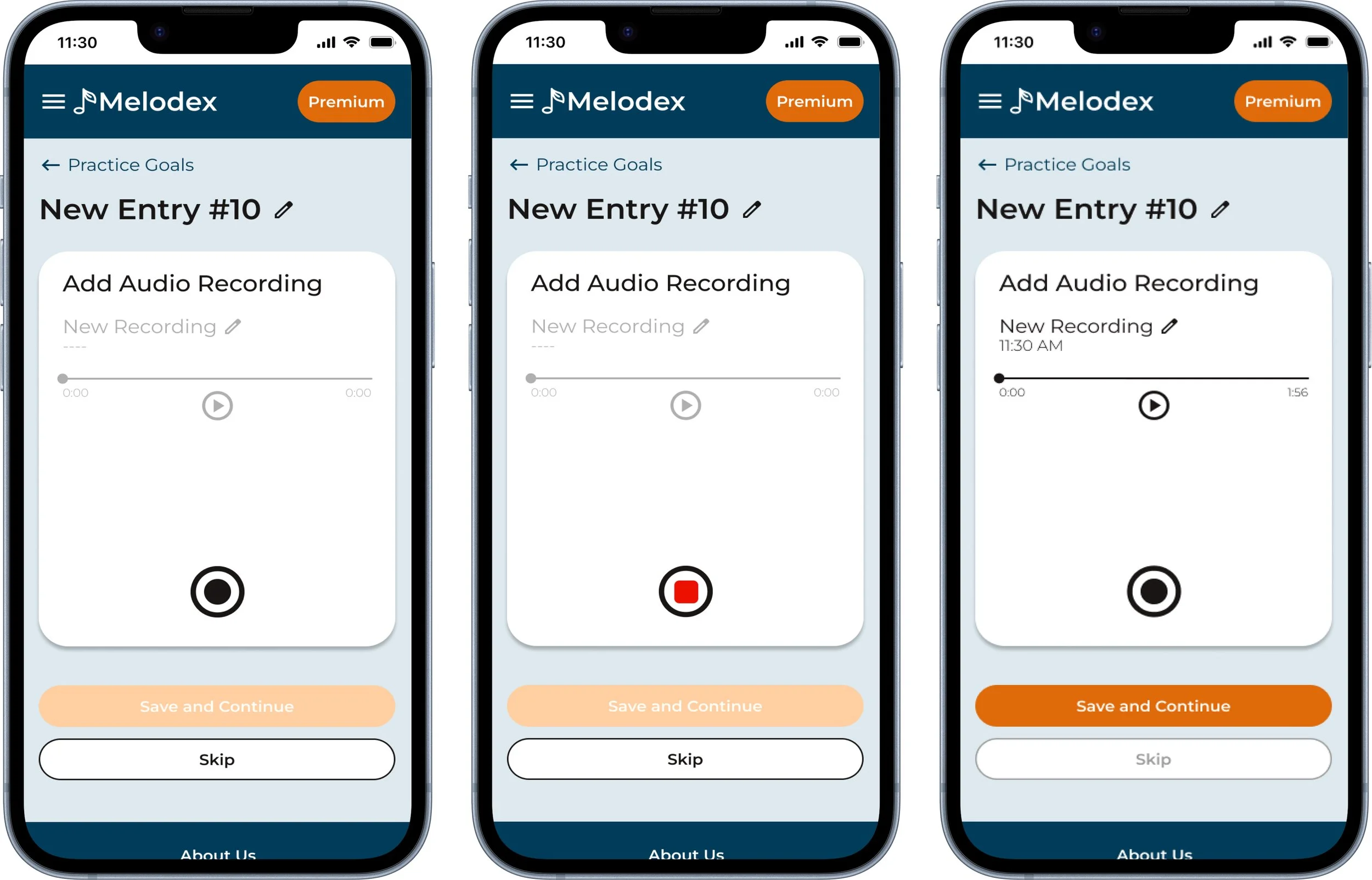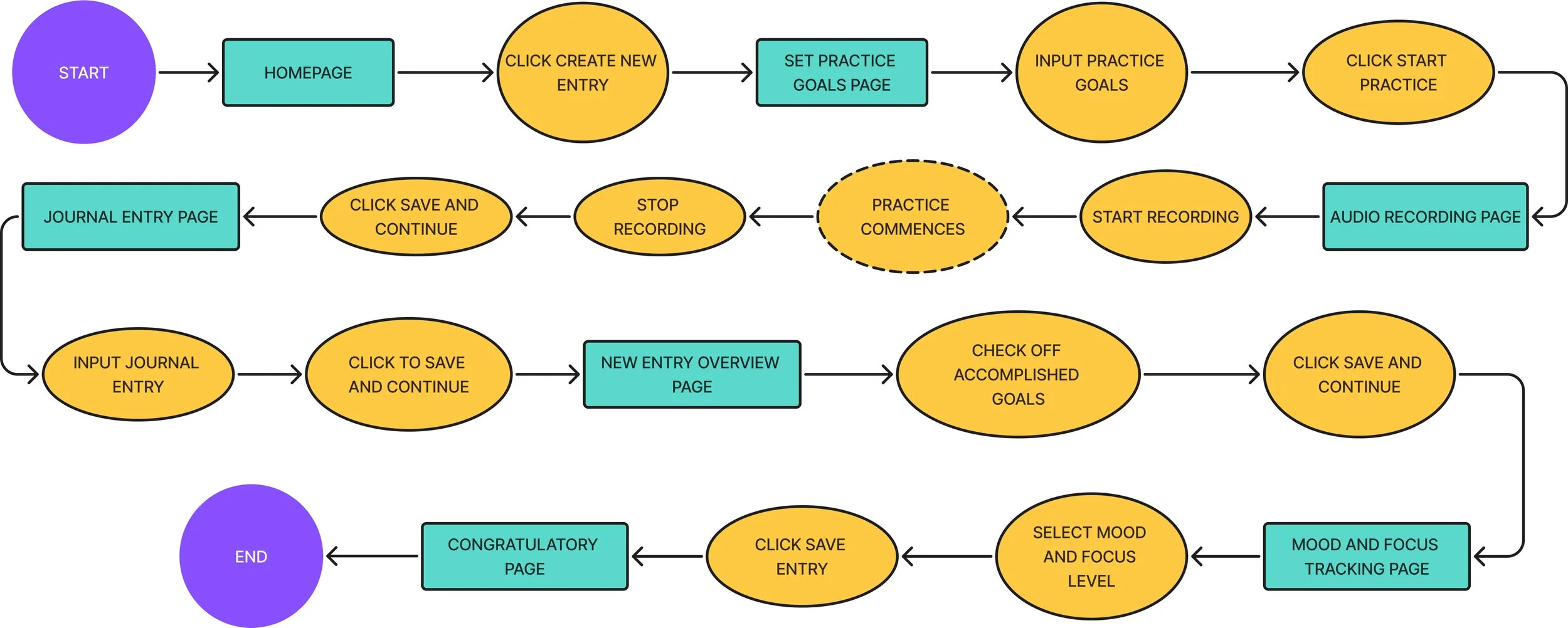 Each practice, users can go through process of saving an entry including setting practice goals, saving an audio recording, and writing a journal entry